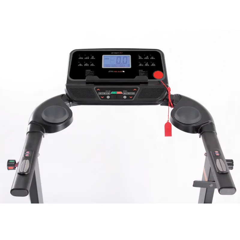 Běžecký pás EVERFIT TFK 455 SLIM je vybaven odpruženou běžeckou plochou o rozměrech 127 x 42 cm, elektronickou regulací stoupání v rozmezí 0-12% a 15 tréninkovými programy. Multifunkční tréninkový počítač s podsvíceným displejem a intuitivním ovládáním (včetně volby rychlosti a stoupání) informuje o všech důležitých tréninkových hodnotách. Uživatelé ocení také jeho komfortní ovládání, možnost předvolby cílových hodnot a snadnou manipulaci, vč. úplného sklopení trenažéru pro úsporu místa. Další výhodou je rychlá a jednoduchá montáž – pás je z velké části v balení již sestaven.