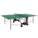 vnitřní stůl, sklopitelný, zelená hrací plocha, 4 zdvojená transportní kolečka, 2 otočná o 360°, síťka součástí stolu, držák na pálky a míčky, bezpečný mechanismus sklopení stolu, hmotnost 69 kg, zelená – černá